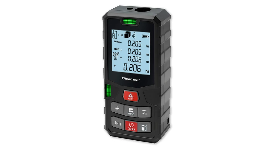 Qoltec Nagy Pontosságú Lézeres Távolságmérő Buborék Szintezővel | LCD háttérvilágítással | 120m